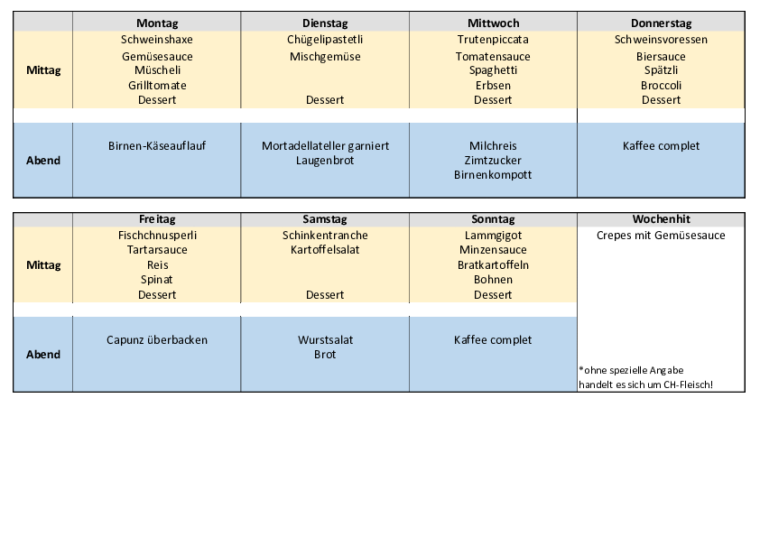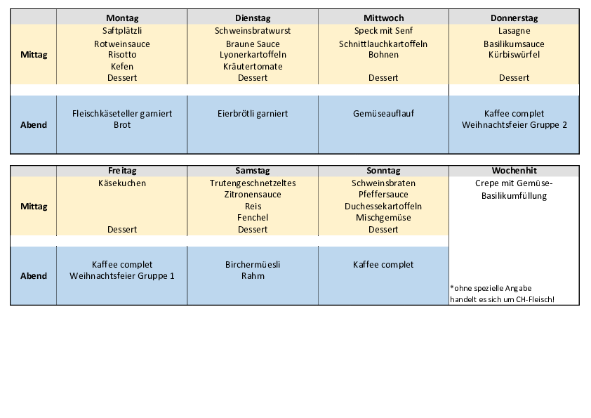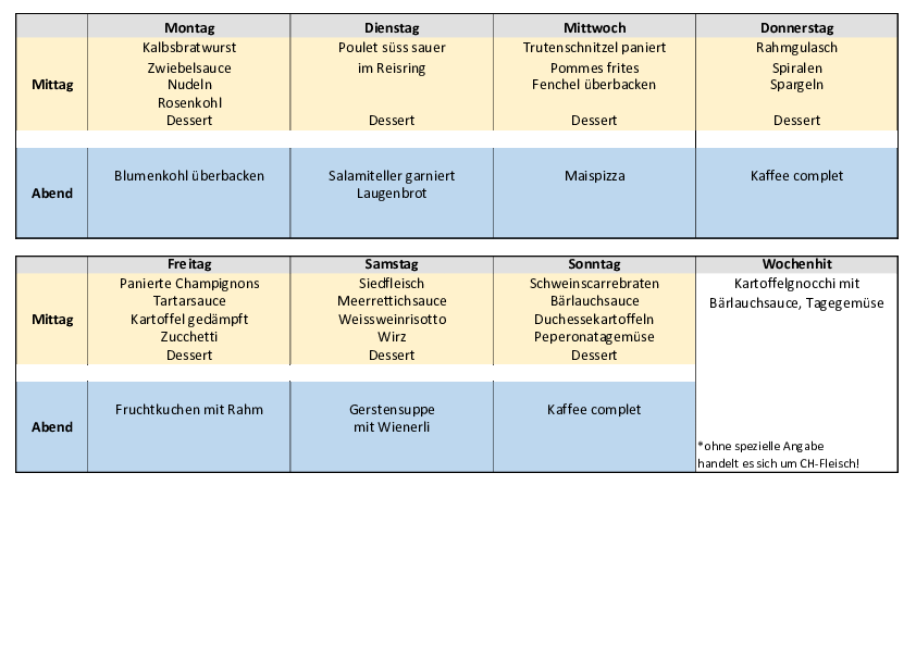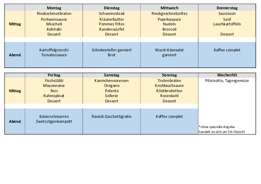 Die Bewohnerinnen und Bewohner haben die Möglichkeit, zwischen dem Tagesmenü oder dem Wochenhit auszuwählen. Ferner können sie aus der kleinen à la carte – Karte ihr Menü selber zusammenstellen.