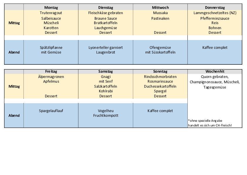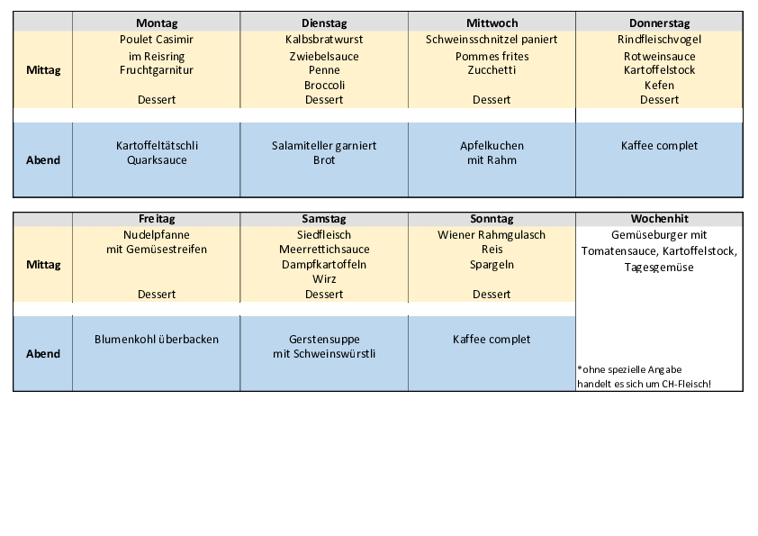Die Bewohnerinnen und Bewohner haben die Möglichkeit, zwischen dem Tagesmenü oder dem Wochenhit auszuwählen. Ferner können sie aus der kleinen à la carte – Karte ihr Menü selber zusammenstellen.